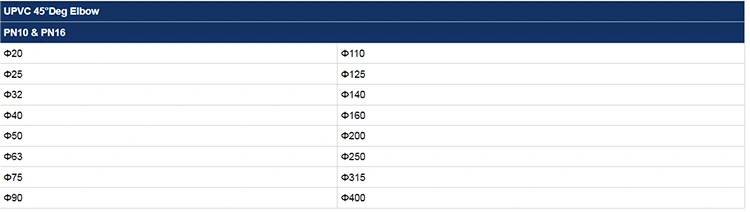 Obecnie łokci PVC 45 ° są szeroko stosowane w systemach zaopatrzenia i drenażu wody, projektach nawadniających, rurociągach budowlanych, krajobrazie, systemach wodnych akwakultury, a także w różnych dziedzinach, takich jak przemysł chemiczny.